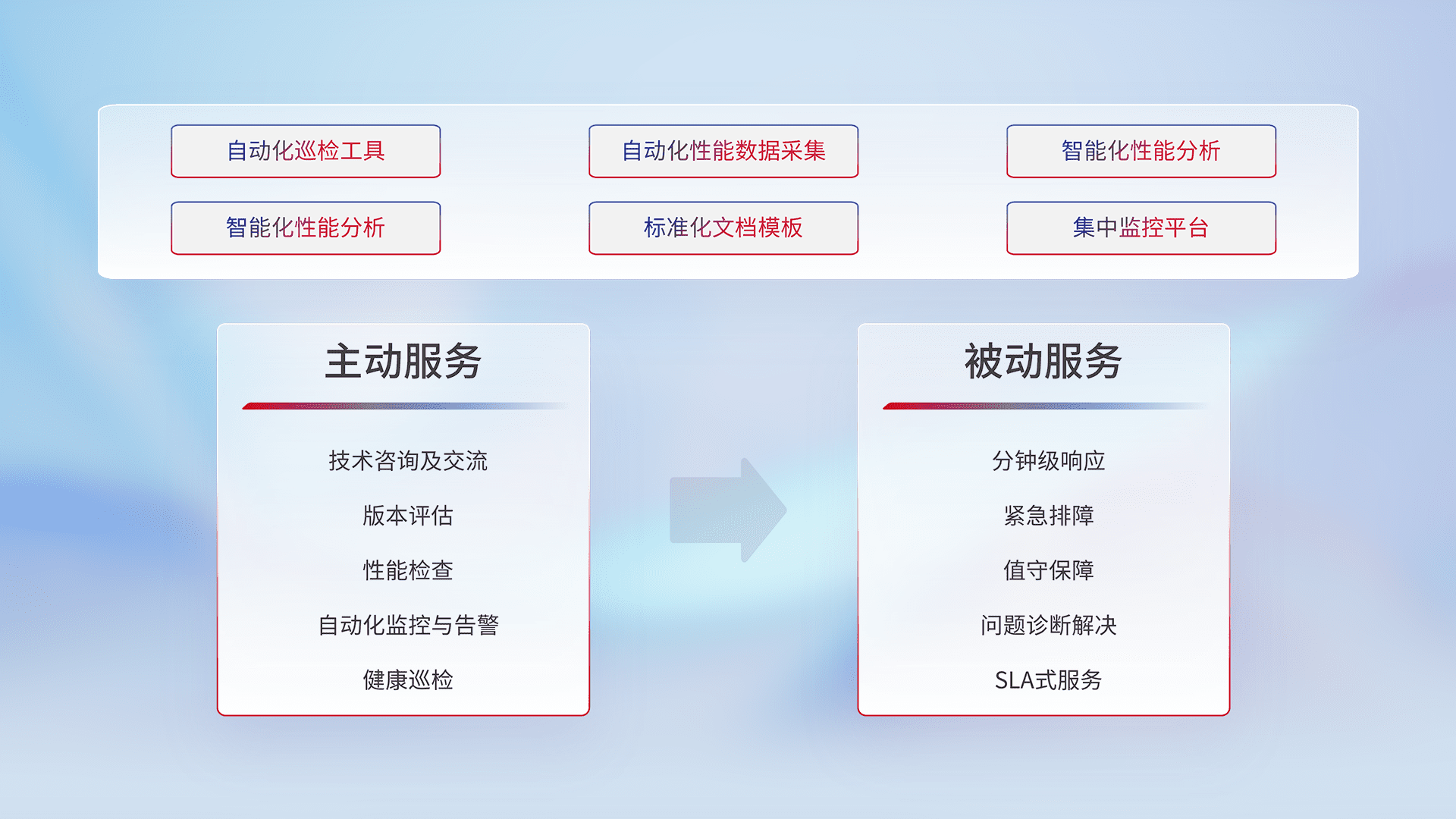 智能化工具和标准化文档,,保障服务质量,,,,提供主动服务(包含技术咨询、、、版本评估、、、、性能检查、、自动化监控与告警、、健康巡检)和被动服务包含(分钟级响应、、、紧急排障、、值守保障、、问题诊断解决、、、、SLA服务)。。