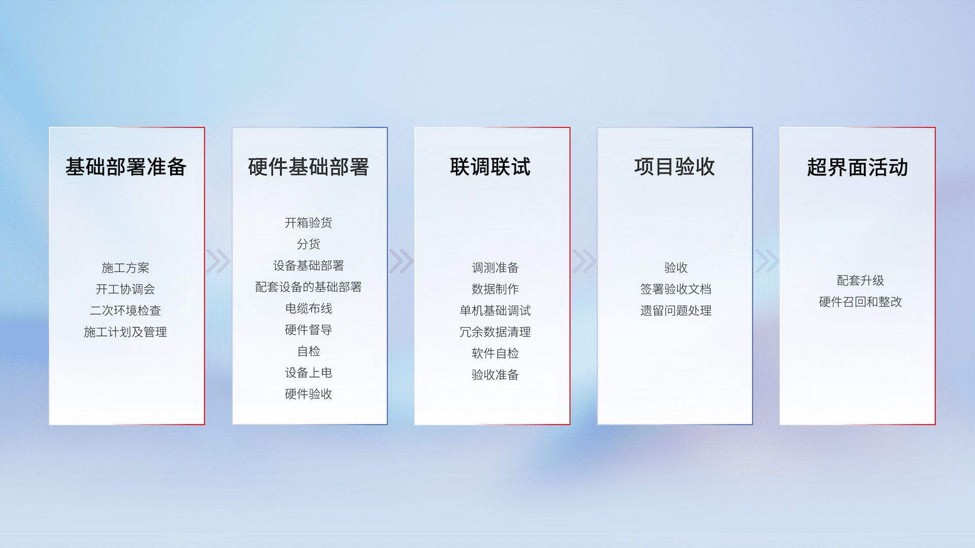 从基础部署准备、、、、硬件基础部署、、、联调联试、、项目验收、、越界面活动的全过程可追溯,,,保证施工质量和进度。。。