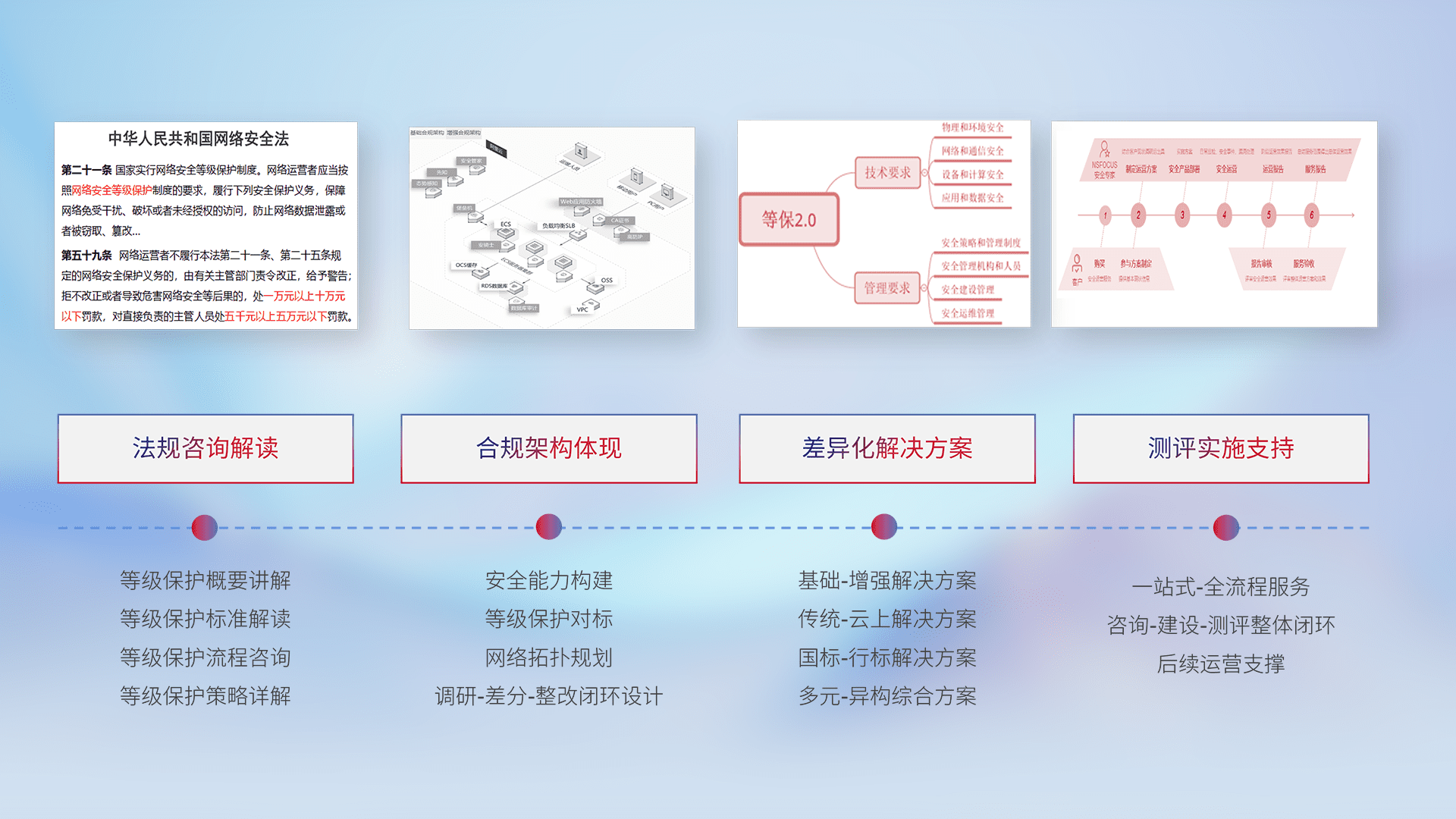 通过专业的法律咨询解读、、、、合规架构体现、、、差异化解决方案、、、、测试实施支持等服务,,,为客户量身打造等保合规体系。。。。